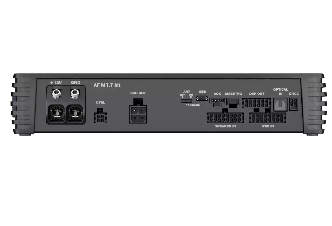 El DSP proporciona ecualización, crossover, gestión de retardo, ajustes de nivel y sonoridad dinámica. El AF M1.7 bit también cuenta con la exclusiva función "Bass-Magnifier", que maximiza la salida de baja frecuencia en el habitáculo para una experiencia auditiva inmersiva y una respuesta dinámica realista.